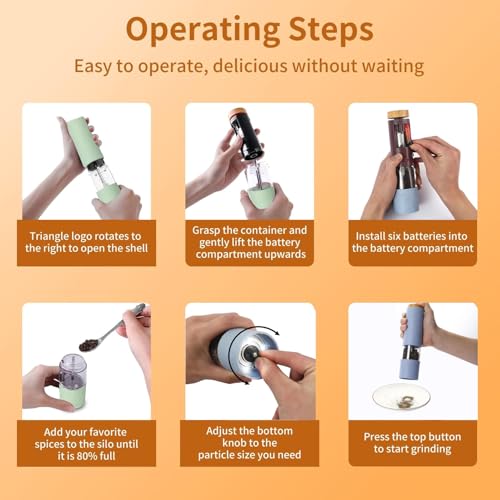 - [إضاءة ليد خفيفة الوزن] تم تجهيز قاعدة المطحنة بإضاءة ليد خفيفة الوزن ستضيء تلقائيًا أثناء الاستخدام، ويمكنك رؤية مكان سقوط التوابل بالضبط. وبهذه الطريقة لن تضطر أبدًا إلى المخاطرة بالإفراط في تتبيل إبداعاتك الطهوية اللذيذة. تتطلب مطحنة الفلفل الكهربائية 6 بطاريات ايه ايه ايه (غير متضمنة).