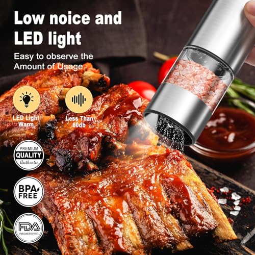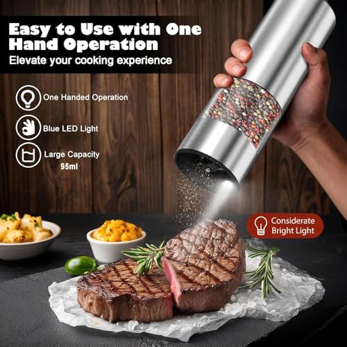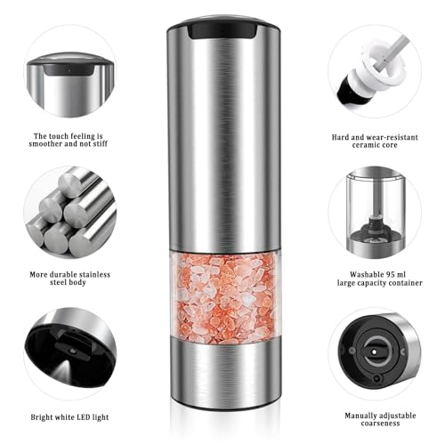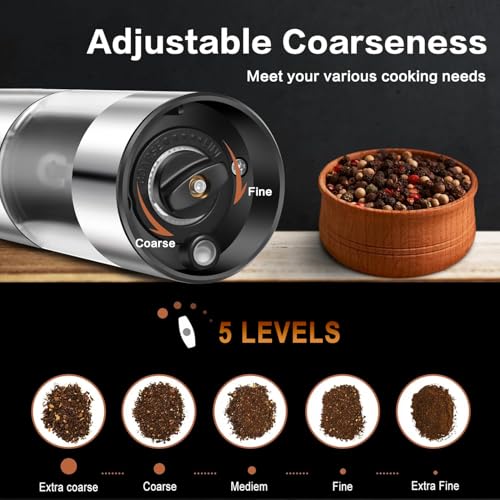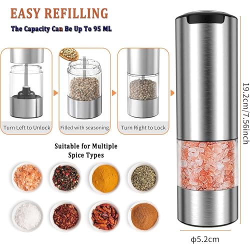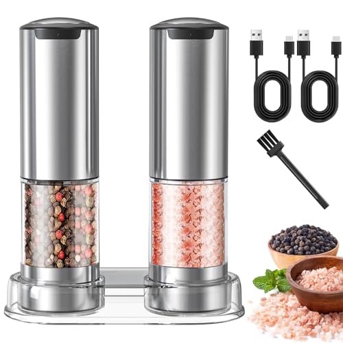 EIOREOE - مجموعة مطحنة ملح وفلفل كهربائية، مجموعة مطحنة ملح وفلفل أوتوماتيكية قابلة لإعادة الشحن من النوع سي مع ضوء ليد، فولاذ مقاوم للصدأ، 5 درجات خشونة قابلة للتعديل، سعة كبيرة 95 مل، قاعدة تخزين، لون فضي