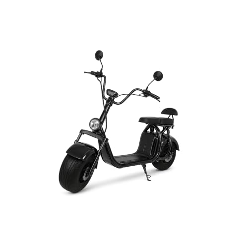 - التصميم: سكوتر كهربائي أنيق على طراز سيتي كوكو باللون الأسود يتميز بإطارات سميكة لتعزيز الثبات ومقعد مبطن مريح لركوب طويل.