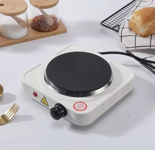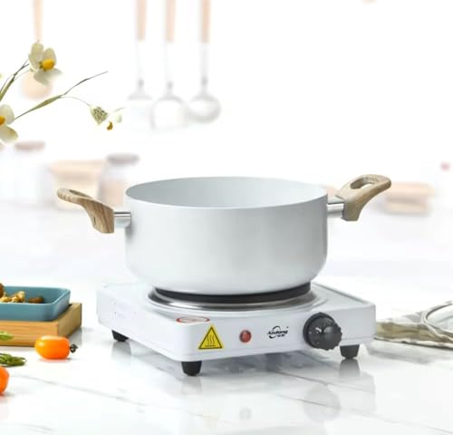 - التصميم: سخان بلاط واحد بتصميم مضغوط أبيض مع قرص دوار من الستانلس ستيل يوزع الحرارة بالتساوي