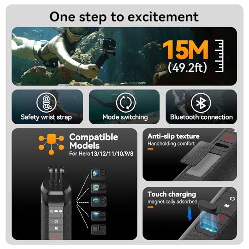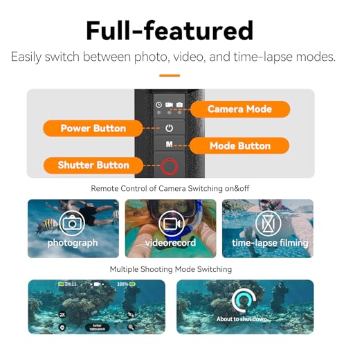 - جهاز تحكم عن بعد بتقنية البلوتوث بيد واحدة: تحكم بشكل مريح في وظائف جو برو حتى تحت الماء من خلال جهاز التحكم عن بعد المدمج على المقبض. يدعم التصوير وتبديل الأوضاع وإيقاف التشغيل عن بعد حتى عمق 15 متر.