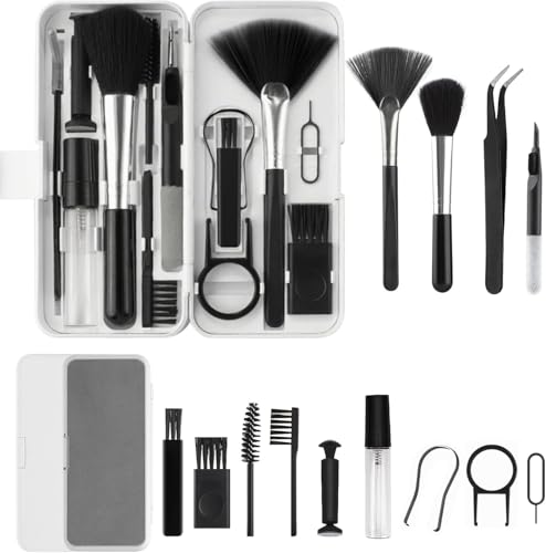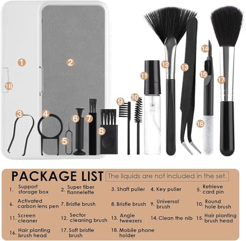 - مجموعة تنظيف 18 في 1 - تتضمن مجموعة التنظيف الإلكترونية صندوق تخزين وقماش فلانيليت من الألياف الفاخرة وأداة سحب العمود وأداة سحب المفاتيح ودبوس إخراج بيت الخط وقلم عدسات من الكربون النشط و2 × فرشاة بشعيرات و1 × فرشاة شاملة وفرشاة ذات فتحة دائرية وبخاخة لتنظيف الشاشة (البخاخة فقط، لا تتضمن السائل. ) وفرشاة تنظيف الفواصل وملاقط للزوايا وقلم بطرف لتنظيف الفجوات و2 × رأس فرشاة زراعة الشعر و1 × فرشاة بشعيرات ناعمة وحامل موبايل.
