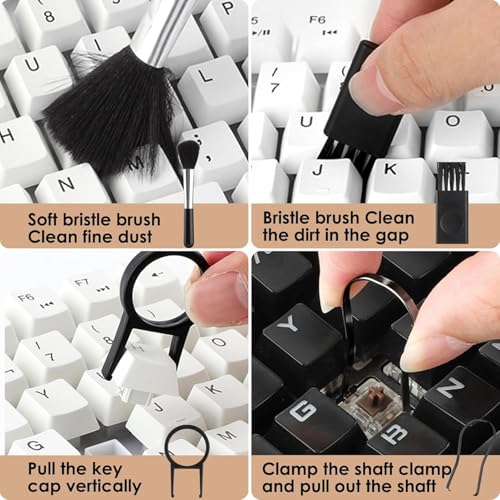 - تنظيف عميق للوحة المفاتيح - تعمل الفرشاة ذات الشعيرات الناعمة على تنظيف الغبار الدقيق، بالإضافة إلى فرشاة ذات شعيرات عالية الكثافة تنظف الأوساخ الموجودة في الفجوات. تقوم أداة سحب المفاتيح بسحب غطاء المفتاح عموديًا، بينما تقوم أداة سحب العمود بتثبيت مشبك العمود وسحب العمود، مما يجعل التنظيف بسيطًا ويسهل تنظيف فجوات الكيبورد. يمكن للملاقط ذات الزاوية المضادة للشحنات الكهربائية إزالة أو رفع مفتاح المسافة لأعلى قليلًا، كما يمكنها تثبيت الأجزاء في فتحات الكيبورد.