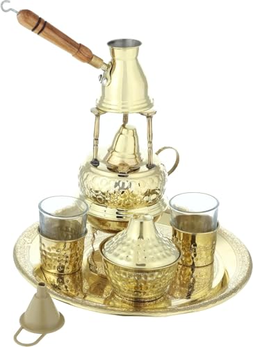 • يحتوي الطقم على سبرتاية نحاسية مزخرفة تضيف لمسة جمالية وأنيقة عند تقديم القهوة.