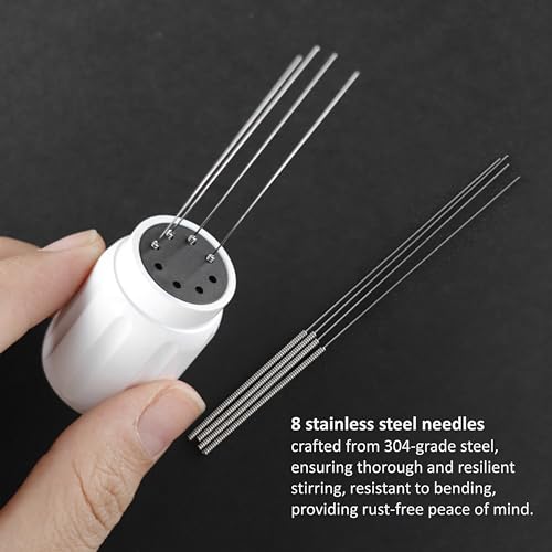 - 2. أدق مع 10 إبر إضافية لتوحيد دقيق: سبع إبر من الستانلس ستيل الآمن غذائيًا، قطر كل منها 0.35 ملم، تكسر القهوة المطحونة ببراعة. مع ثلاث إبر إضافية وأنبوب تخزين ذكي، وداعًا لمشاكل الإبرة المنحنية.