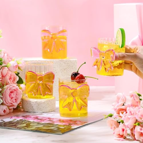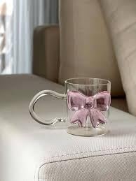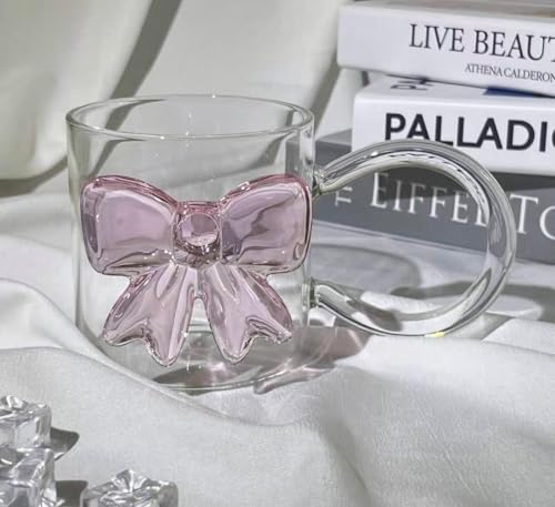 Generic - كوب زجاجي شفاف 300 مل مزين بفيونكة بينك من اليجانت للقهوة والعصير والحليب، هدية للبنات والنساء، ادوات شرب على شكل فيونكة للاستخدام اليومي، هدايا وديكور منزلي (مجموعة من قطعة واحدة)