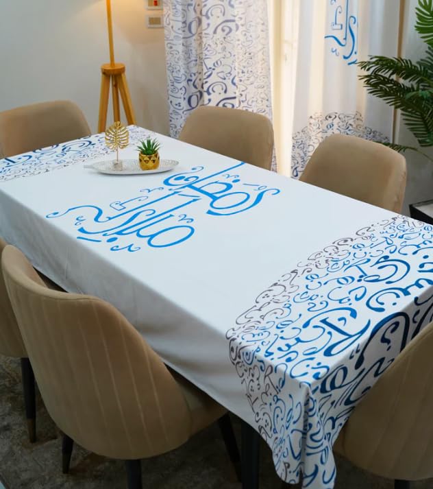 Generic - مفرش طاولة انيق بخط عربي ابيض وازرق، قماش مخملي ناعم، متوفر بمقاسات متعددة، تصميم عصري لطاولات الطعام 6-8 اشخاص (140 × 240)