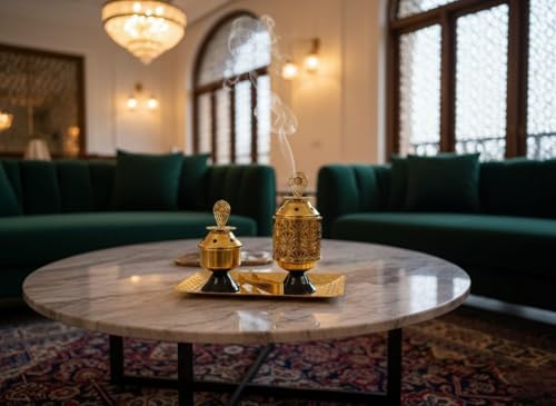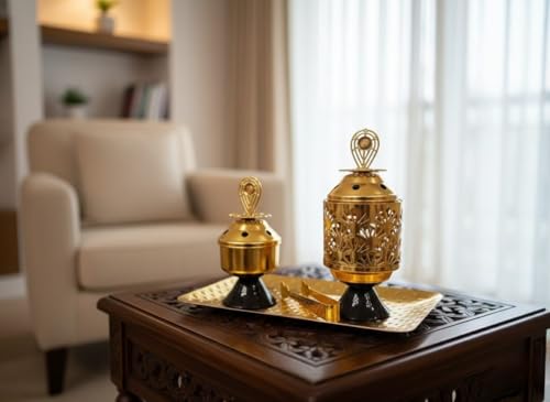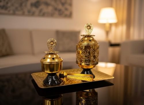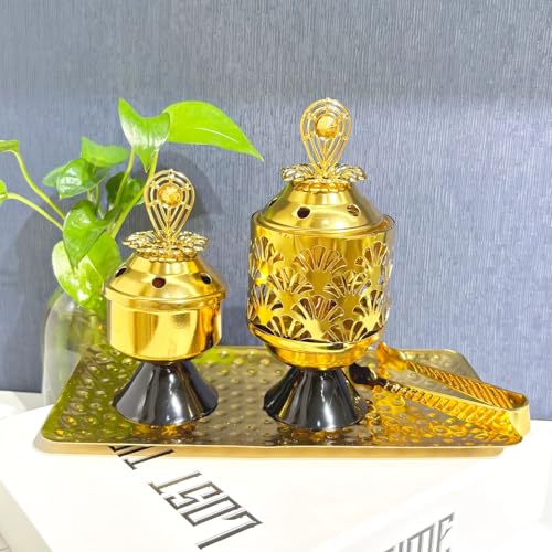 Generic - مبخرة بتصميم عربي أنيق ذهبي حاوية بخور العيد عتيق افران اطلاق الروائح العلاجية لشهر رمضان مبارك ديكور طاولة الحفلات الاسلامية معدن مع صينية أنيقة تجمع لك المبخرة وعلبة البخور والملقط