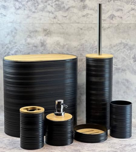 Generic - طقم أكسسوارات حمام أنيق، أسود، بغطاء خشب ، مجموعة ٦ قطع، تصميم عصري مع أغطية خشبية، موزع صابون وحامل فرشاة المرحاض
