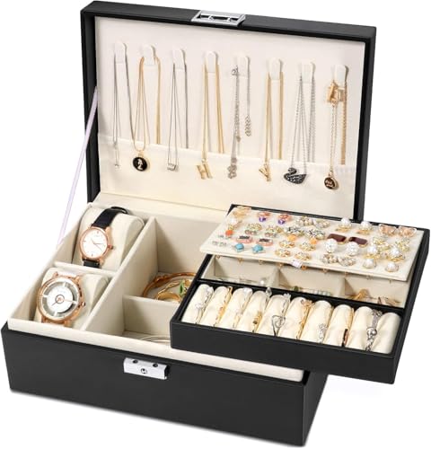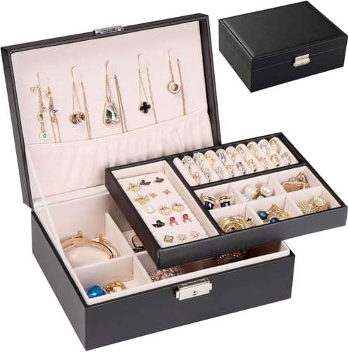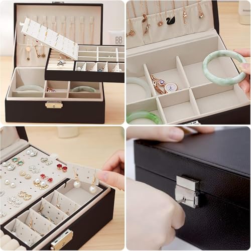 Generic - منظم مجوهرات من الجلد الأسود بطبقتين وقفل مفاتيح للخواتم والسلاسل والأساور والاكسسوارات، 23 سم
