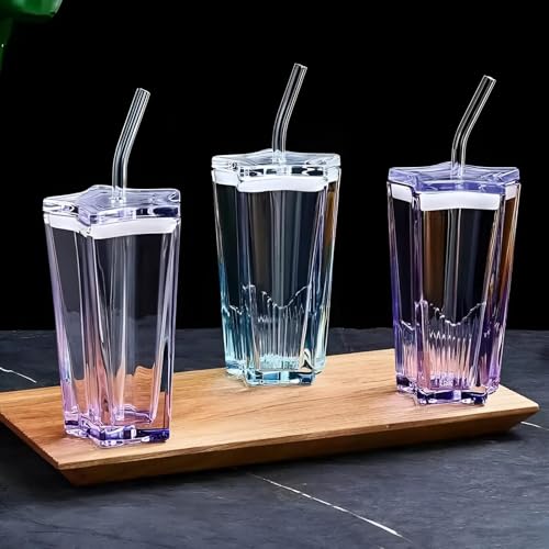 Generic - كوب زجاج أنيق مع غطاء على شكل نجمة وجوانب مثلثة لقبضة محكمة الغلق ومقاومة للتسرب مما يوفر تجربة حسية فاخرة مع كل مشروب مبرد وكوب مثلج ملون