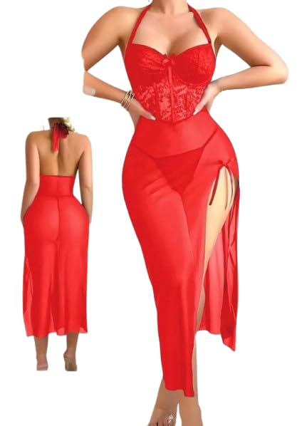 Generic - فستان سهرة انيق، رقبة على شكل قلب، تصميم بفتحة عالية، طول متوسط، نمط بدون ظهر، حتى 75 كجم (احمر)