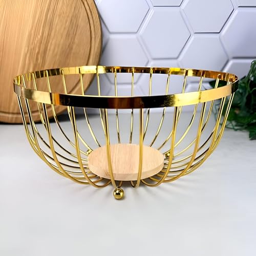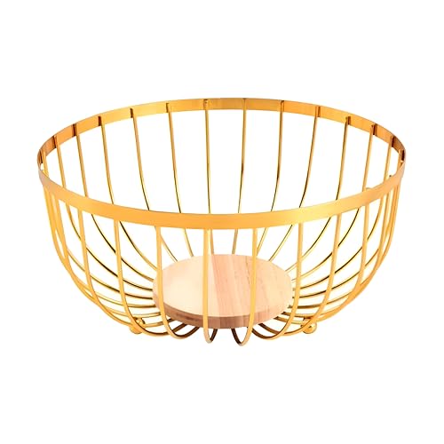 - يتميز وعاء الفاكهة الذهبي المعدني الأنيق هذا بقاعدة خشبية متينة تضيف الدفء الطبيعي والانسجام البصري، مما يخلق توازنًا مثاليًا بين المعدن الفاخر وقوام الخشب العضوي لأي مكان أنيق.