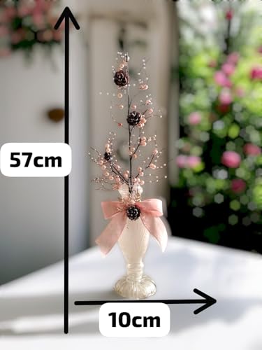 Generic - مزهرية زجاجية انيقة مع مخاريط صنوبر وفيونكة وردية، ترتيب زهور مزخرف، ارتفاع 57 سم، قاعدة بلورية بيضاء