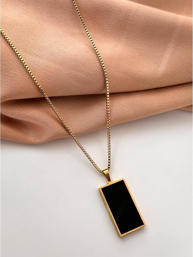 Generic - سلسلة ذهبية انيقة مع دلاية مستطيلة، حجر كريم اسود وابيض لؤلؤي، مجوهرات عصرية للنساء