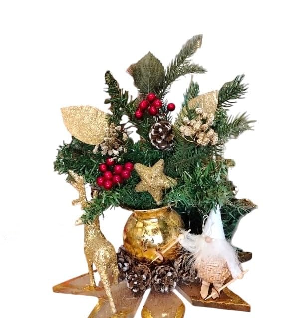 - عرض متعدد الاستخدامات: يجمع بين وعاء ذهبي معدني مع المساحات الخضراء الاحتفالية، مما يجعله مناسبًا لكل من ديكور العطلات التقليدي والعصري