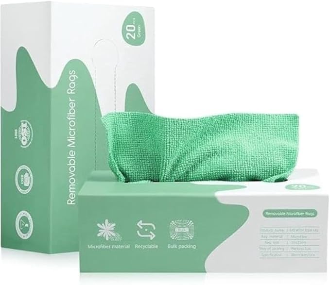 - حافظ على منزلك نظيفًا مع هذه المجموعة المكونة من 20 قطعة من المناديل المصنوعة من المايكروفايبر القابلة لإعادة الاستخدام باللون الأخضر. تأتي الفوط عالية الامتصاص وبدون حواف في صندوق توزيع عملي، مثالية لجميع احتياجاتك من التنظيف والغسيل وإزالة الغبار. يبلغ مقاس كل فوطة 20 × 20 سم.