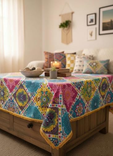 AREXOL - مفرش طاولة خيامية انيق 150 × 220 سم من القماش الفاخر الناعم بنمط دانتيل اصفر مزخرف لطاولة الطعام من الكتان للاستخدام المنزلي