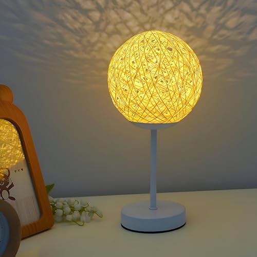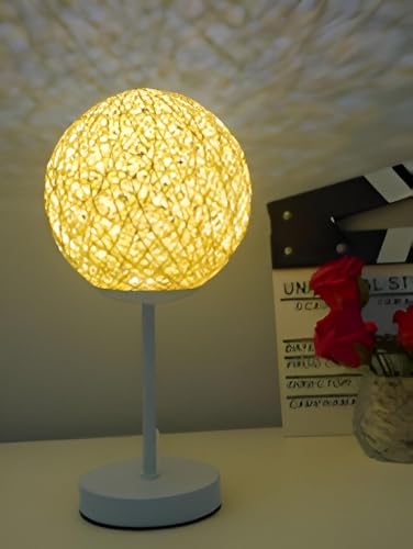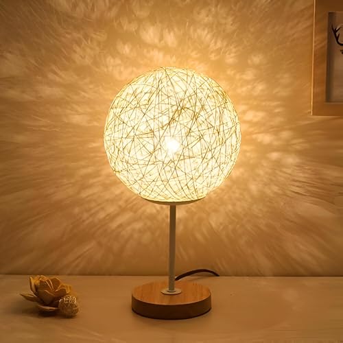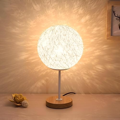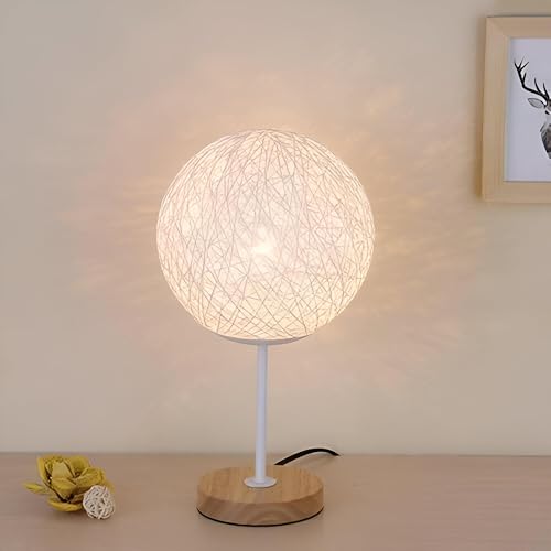Generic - عاكس الضوء الانيق - مصباح طاولة عصري كروي متوهج مصنوع من خيوط متشابكة دقيقة مع إضاءة دافئة ناعمة، قاعدة خشبية، وحامل معدني رفيع، مما يخلق ديكورًا محيطًا مريحًا لغرف النوم