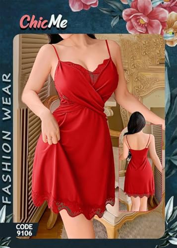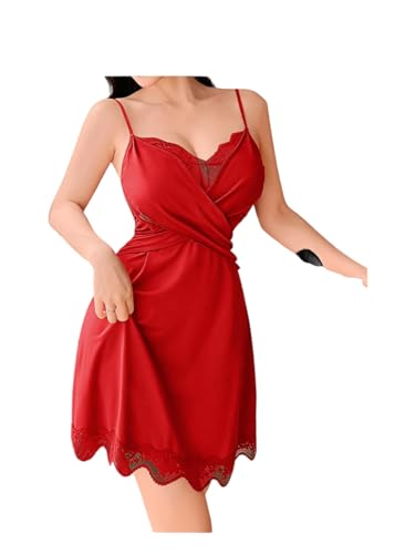 Generic - قميص نوم لانجري أنيق بتصميم فستان من الليكرا، تفاصيل حواف من الدانتيل ورقبة على شكل حرف V وحمالات رفيعة