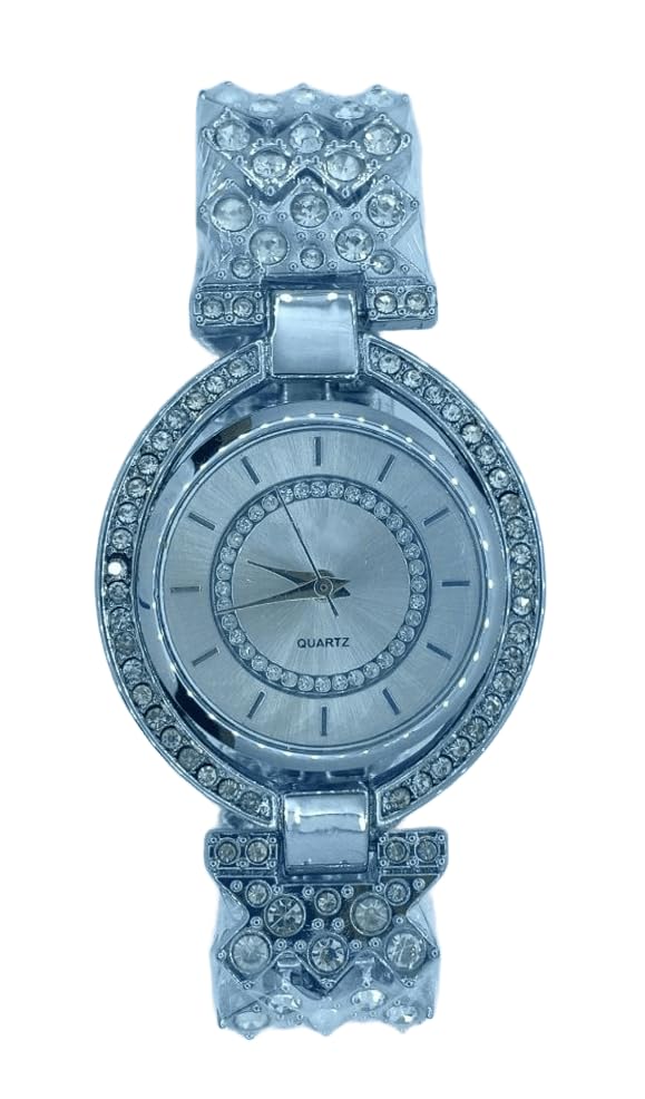 Generic - ساعة يد نسائية كوارتز أنيقة - سوار فضي بتصميم هندسي مرصع بالكريستال اللامع.