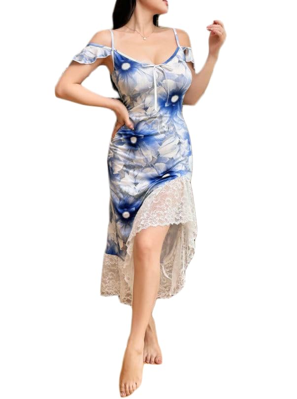 Generic - قميص نوم انيق رومانسي مطبوع عليه زهور مع كشكشة دانتيل للنساء، بيبي دول مثالي للصيف، مقاس واحد