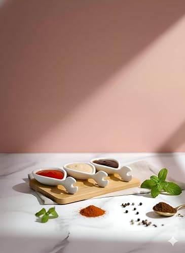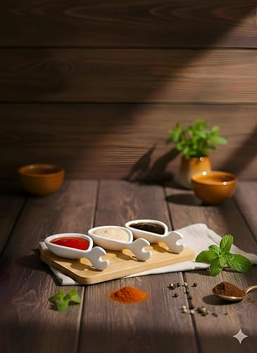 Generic - صلصات انيقة - مجموعة توابل سيراميك فاخرة مستوحاة من جمال الطبيعة، بتصميمات ناعمة على شكل ورقة شجر على سطح ابيض لامع. تتضمن قاعدة عرض خشبية دافئة.