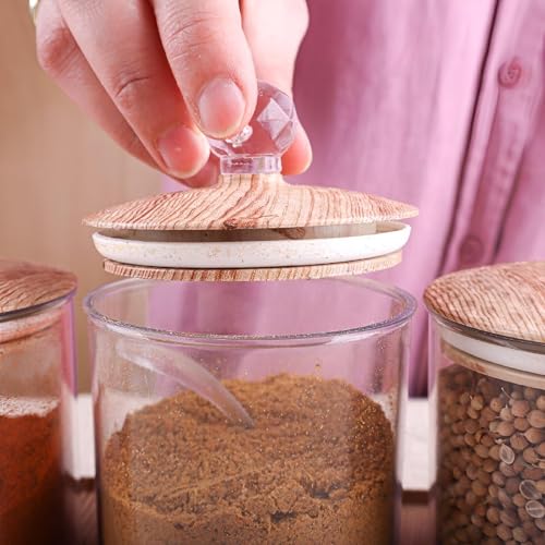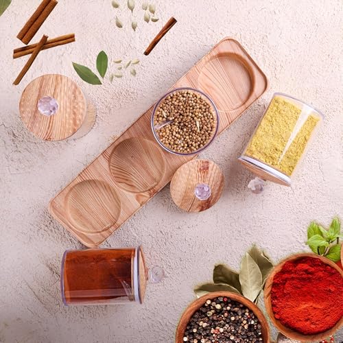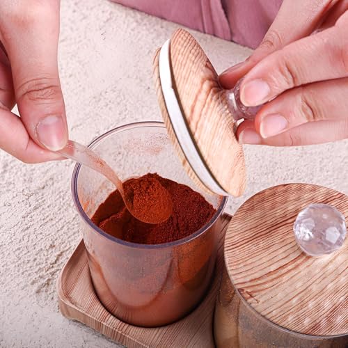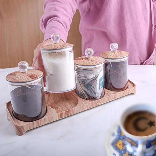 - تتميز مجموعة برطمانات التوابل هذه بأربع حاويات مصنوعة من الأكريليك الشفاف والمتين، مما يسمح بسهولة التعرف على المحتويات، تكملها أغطية الخيزران وقاعدة من الخيزران غير قابلة للانزلاق، مما يجعلها إضافة أنيقة وعملية لأي مطبخ أو ركن قهوة.