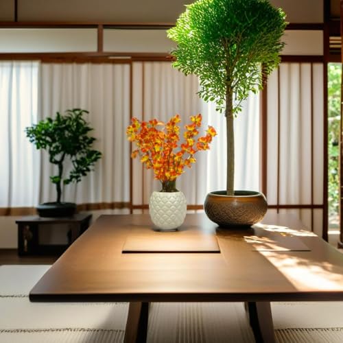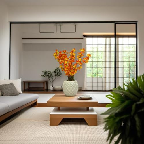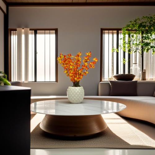 - تصميم فريد: مزهرية بيضاء أنيقة بنمط محفور مميز، مع زهور صناعية برتقالية وصفراء زاهية تضيف لمسة حيوية لأي مساحة