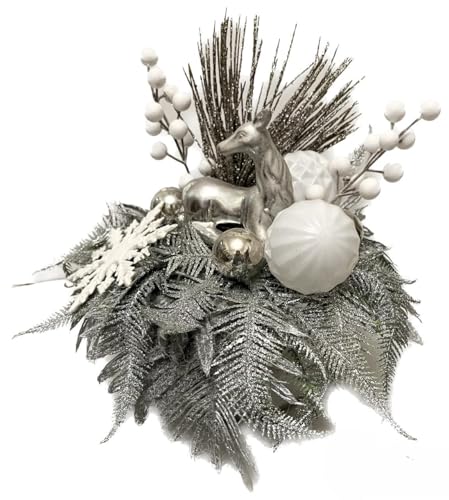 Generic - مجموعة زهور انيقة للعطلات الشتوية مع فروع صنوبر فضية وحلي بيضاء ولمسات معدنية، قطعة مركزية صناعية للكريسماس