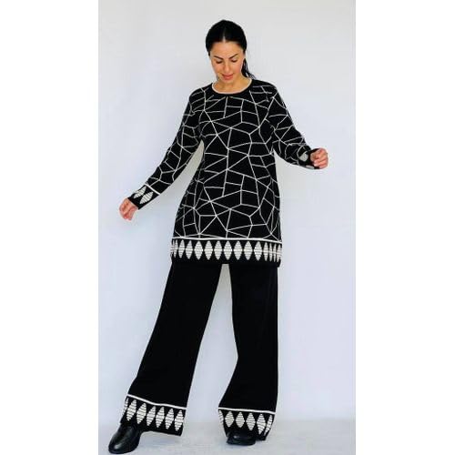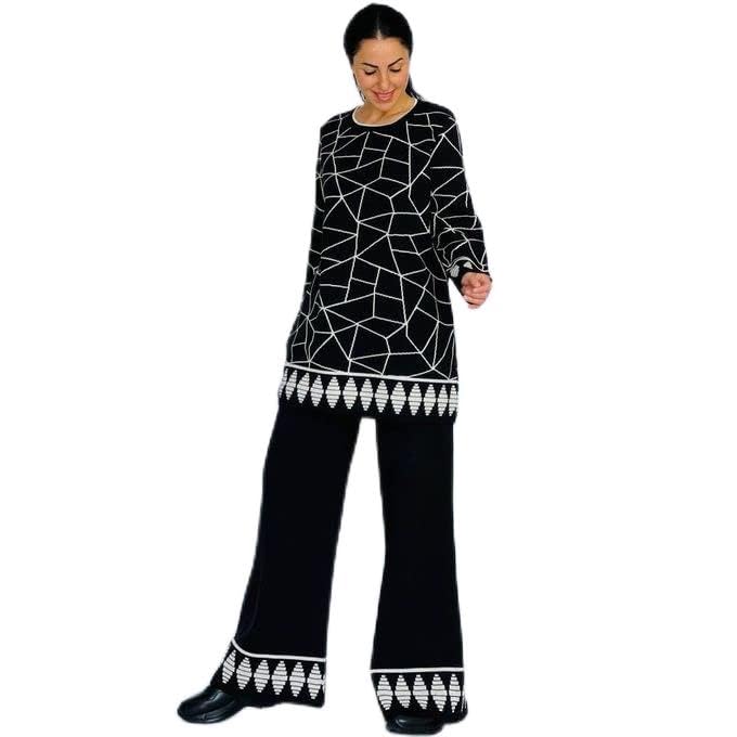 Generic - طقم انيق من قطعتين للنساء - بلوزة طويلة منقوشة هندسية وسروال بارجل واسعة