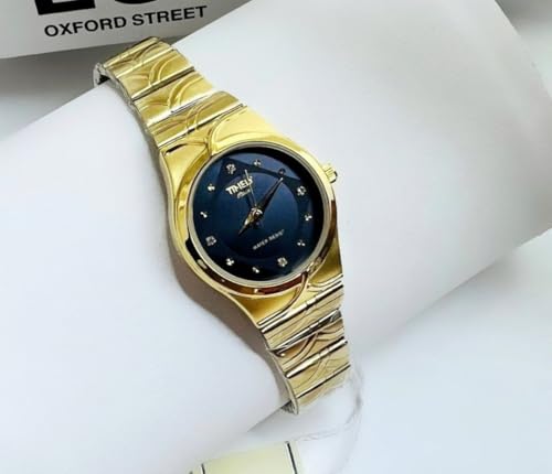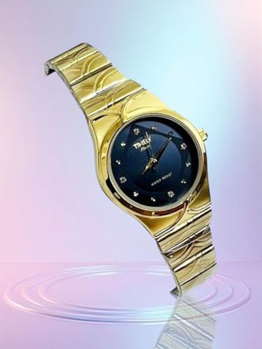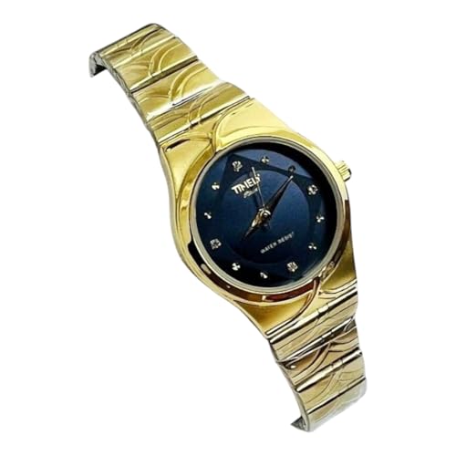 Generic - ساعة يد نسائية أنيقة، إطار ذهبي، مينا زرقاء مع كريستال، سوار معدني