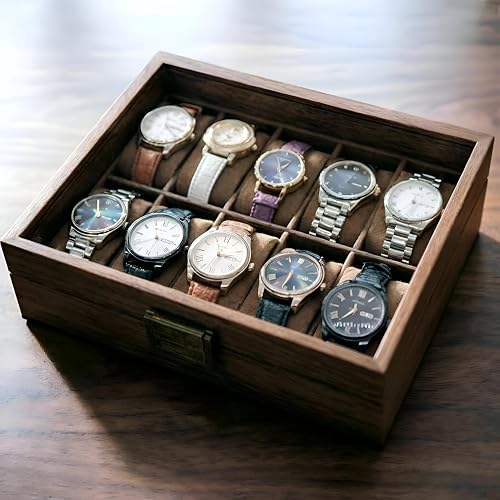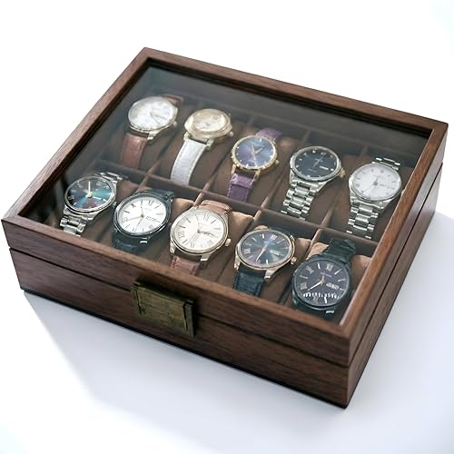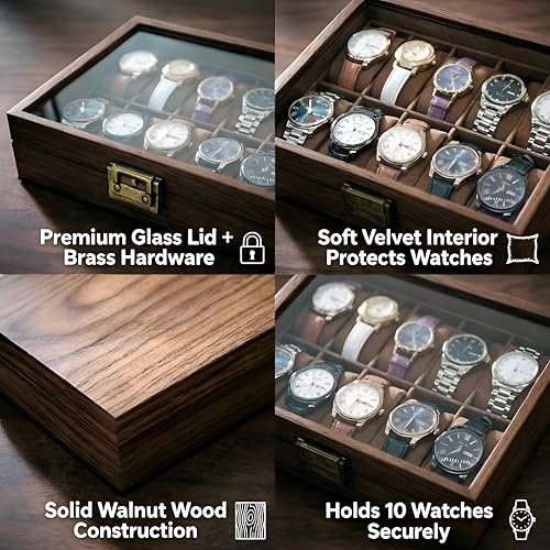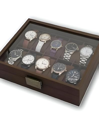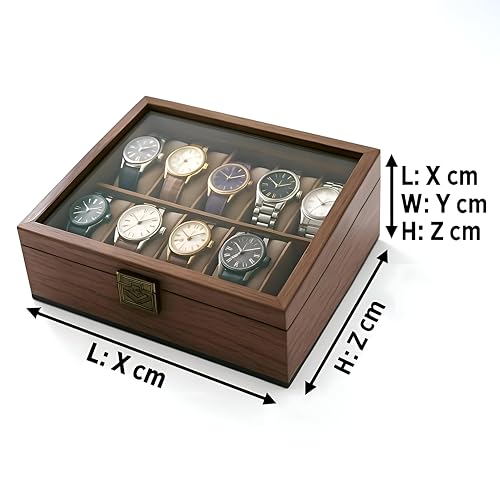 Generic - صندوق ساعة خشبي انيق - تخزين ممتاز لـ 10 ساعات مع غطاء زجاجي وبطانة مخملية ناعمة بلمسة نهائية بنية غنية، مثالي لهواة الجمع والتنظيم الامن.