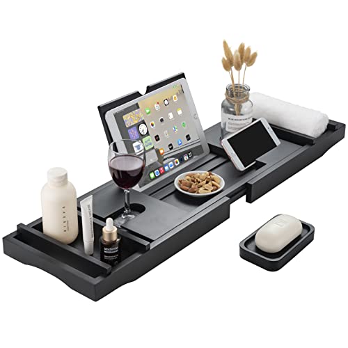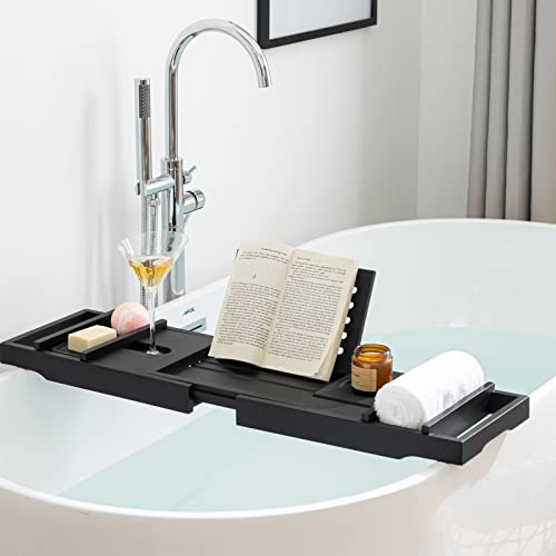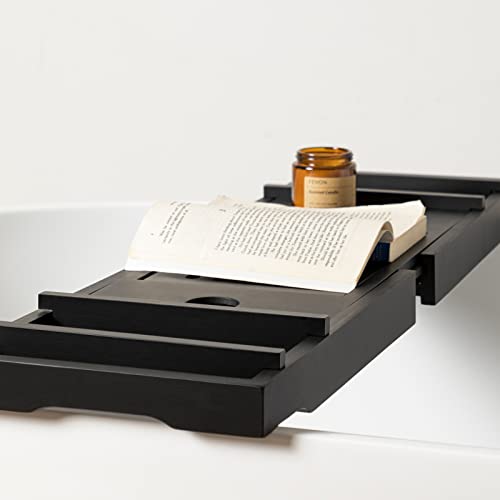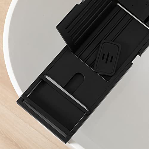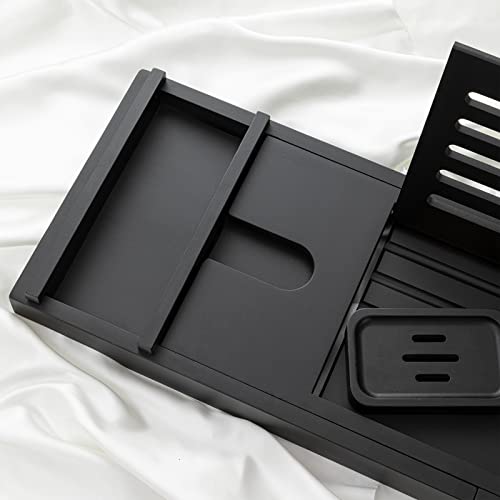 eletecpro - اليتيك برو صينية حوض استحمام من الخيزران مع حامل مناشف منزلق نبيذ وضع اكواب طبق صابون مساحة للكتب وفتحة للجوال منظم الخشب الطبيعي قابل للتعديل للسبا والحمام اسود بامبو مستطيلي
