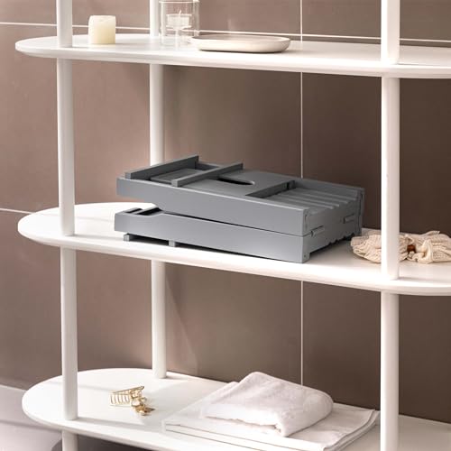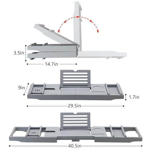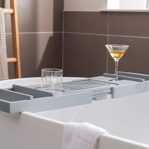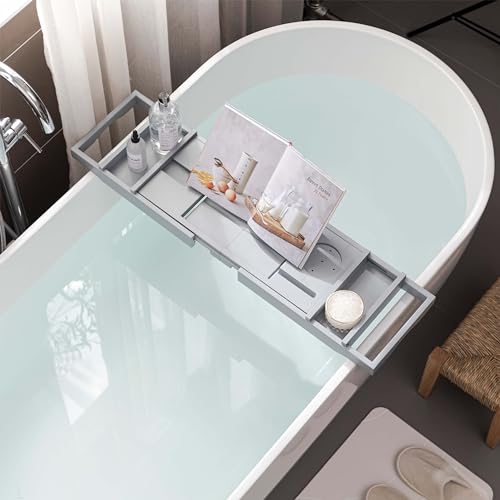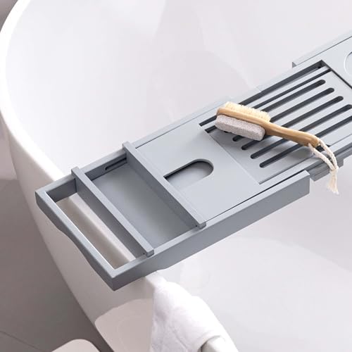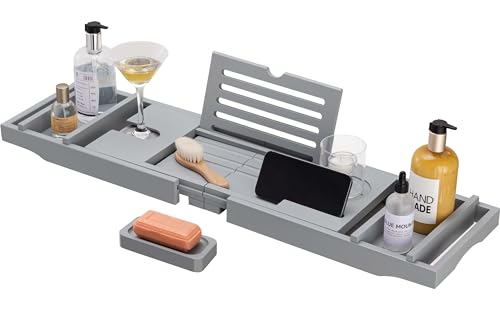 eletecpro - اليتيك برو صينية حوض استحمام من الخيزران قابلة للطي والتوسيع، حامل لوازم الاستحمام مع علبة عملية وطبق صابون للسبا الممتعة، مساحة للكتب وفتحة للهاتف للقراءة، رمادي