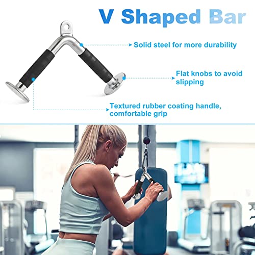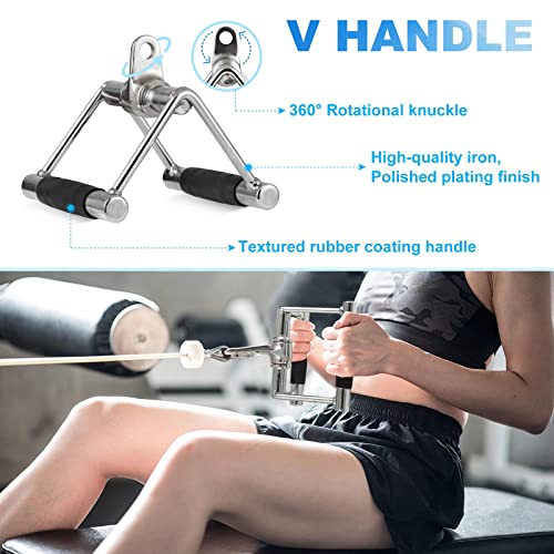 - 【مقبض على شكل حرف V مع قضيب دوار على شكل حرف V】مصنوع من الستيل الصلب عالي الجودة ولمسة نهائية من الكروم اللامع لمزيد من المتانة، مع لمسة نهائية مزخرفة لقبضة وأمان أفضل أثناء التدريبات. فتحة 0.6 انش يمكن أن تناسب بسهولة جميع أنظمة الكابلات لصالة الألعاب الرياضية المنزلية. سعة الوزن: حتى 1650 باوند.