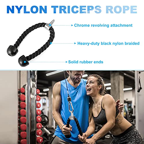 - 【حبل ثلاثي الرؤوس مضفر من النايلون】مصنوع من حبل مضفر من النايلون الأسود شديد التحمل مع أطراف مطاطية صلبة وملحق دوار مطلي بالكروم يوفر حركة دوران سلسة. يعمل حبل ثلاثي الرؤوس على تحسين قوتك الأساسية وعضلاتك، والعضلة ذات الرأسين، ومرن اليد، وشبه المنحرف، وأسفل الظهر، وعضلات تيريس، والدالية. سعة الوزن: حتى 1300 باوند.