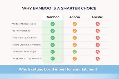 - مقاومة للرطوبة: يتم معالجة ألواح التقطيع المصنوعة من البامبو بالحرارة عند 350 درجة مئوية لمزيد من القوة ومقاومة الرطوبة. هذه العملية، التي تسمى الكربنة، تغلق سطح البامبو، مما يجعلها أقل عرضة للتلف وأفضل في طرد الماء. تساعد على منع الاعوجاج والتشقق والبقع - مما تحافظ على مظهر اللوح الخاص بك رائعًا لسنوات. متينة وأنيقة ومصممة لتدوم طويلاً.