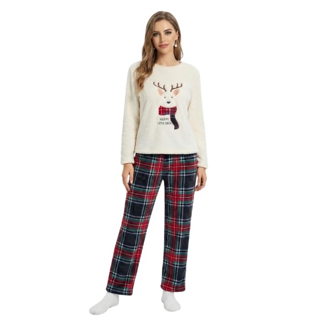 Generic - بيجاما نسائية بتصميم أيل، طقم من قطعتين، بلوزة بيضاء وبنطال كاروهات، ثيم عيد الميلاد