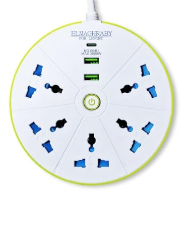generic - شريط طاقة دائري من المغربي - 2000 واط، 10 امبير/ 220-250 فولت، مع 5 منافذ، كيبل 1.5 متر، 2 منفذ USB ومنفذ نوع C لاجهزة اللابتوب والكمبيوتر وماك بوك والاجهزة المنزلية والمكاتب وشواحن الجوال