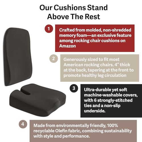 - قم بتحويل كرسيك الهزاز الصلب: ستحصل على ما تدفع ثمنه. يبلغ سمك مخداتنا 10 سم وكبيرة بما يكفي لمعظم الكراسي الهزازة الأمريكية - مخدات مريحة وداعمة للكراسي الهزازة، وليست مجرد ديكور. تضمن الأربطة الموضوعة بشكل مثالي على كلا المخدتين والجوانب السفلية غير القابلة للانزلاق بقاء المخدات في مكانها وعدم تحريكها بشكل مزعج.