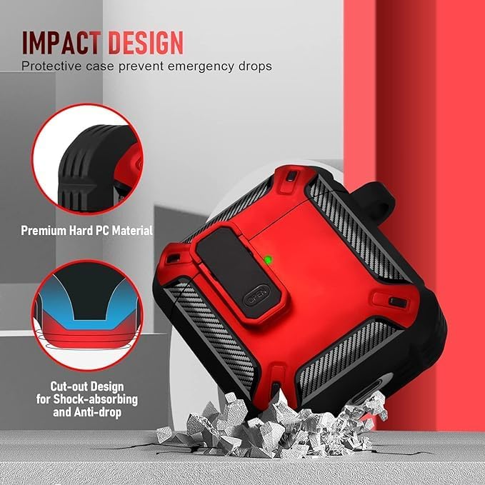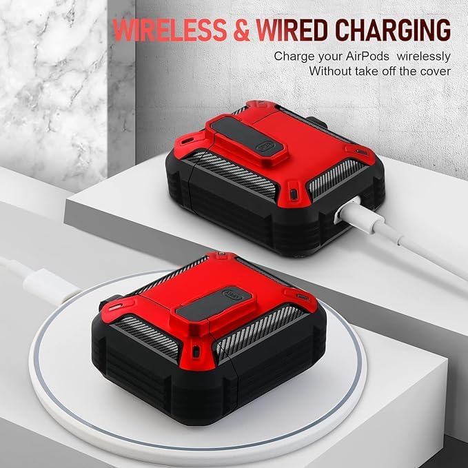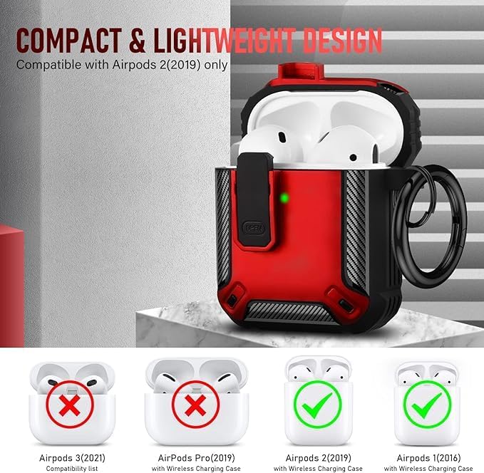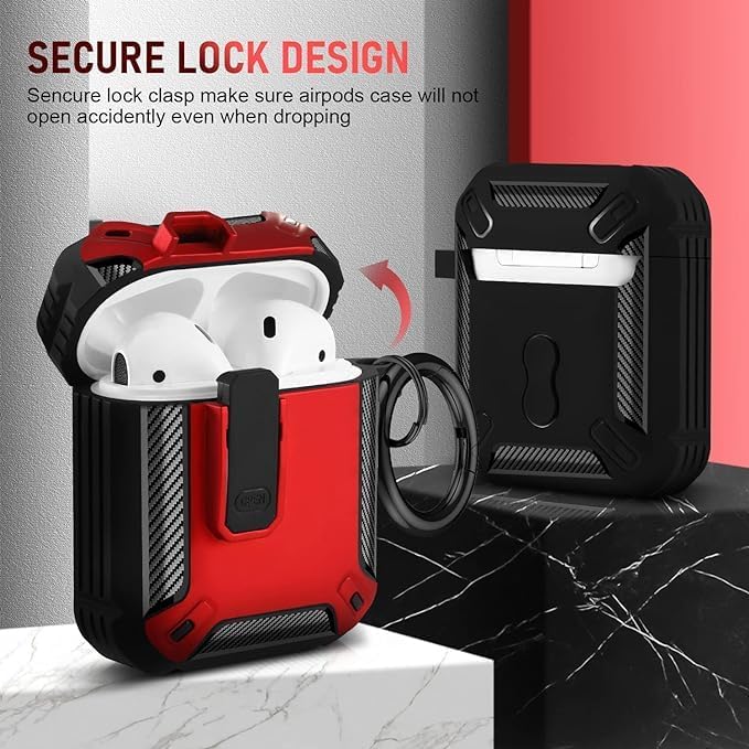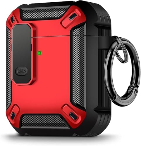 ELMO3EZZ - جراب حماية لسماعة ايربودز الجيل 1 و2 للرجال والنساء من المعز مع مشبك إغلاق آمن، جراب متين بتغطية كاملة مقاومة للصدمات بدرجة عسكرية مع ميدالية مفاتيح، أحمر