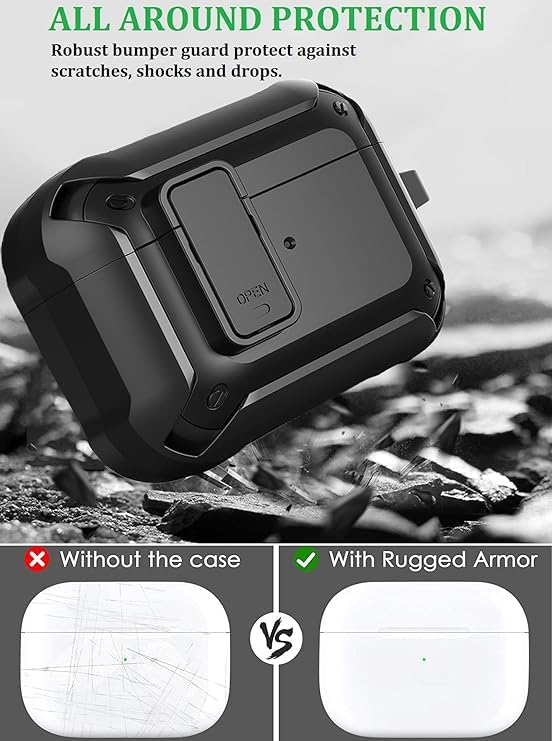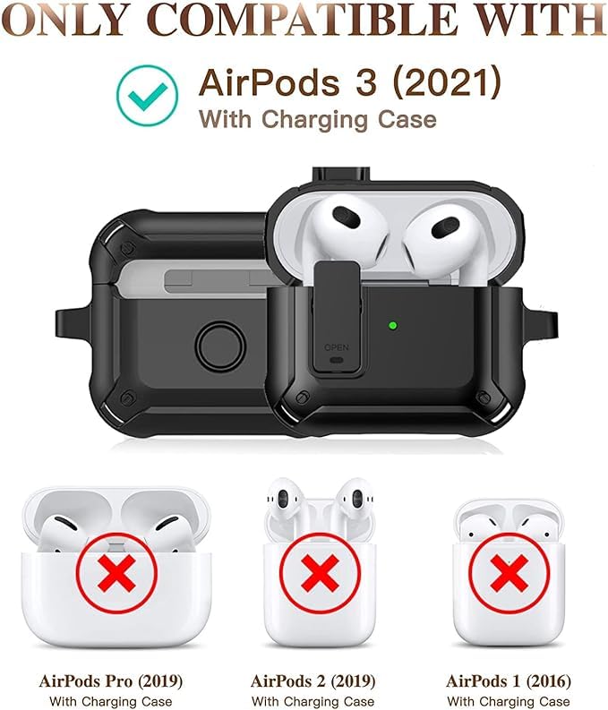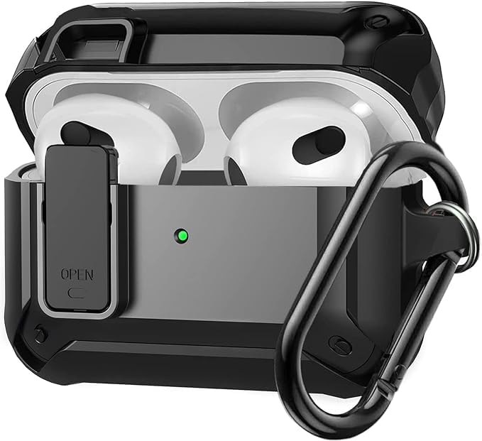 ELMO3EZZ - علبة شحن كاملة مزودة بقفل أمان متينة لسماعة ابل ايربودز الجيل الثالث، علبة شحن متينة مضادة للصدمات مع حلقة للرجال من المعز، لون أسود