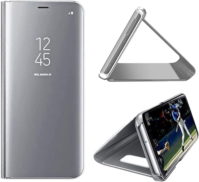ELMO3EZZ - حافظة حماية متوافقة مع موبايل سامسونج جالاكسي S23 الترا من الموعز، بتصميم مرآة على شكل كتب لوضع المكياج مع نافذة شفافة للرجال والنساء، جراب قلاب لهاتف جالاكسي S23 الترا، فضي عاكس كيو اتش، سيليكون