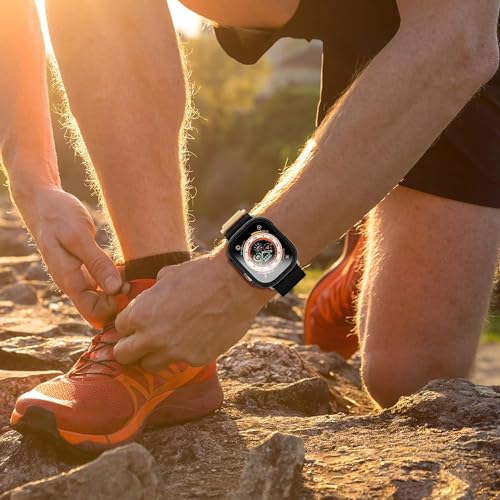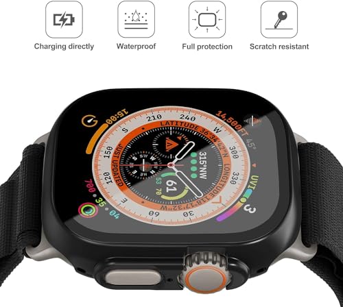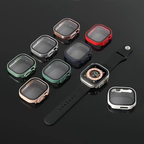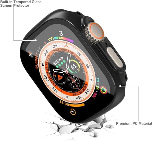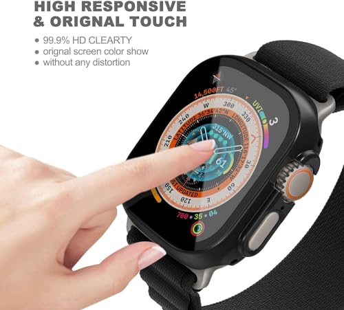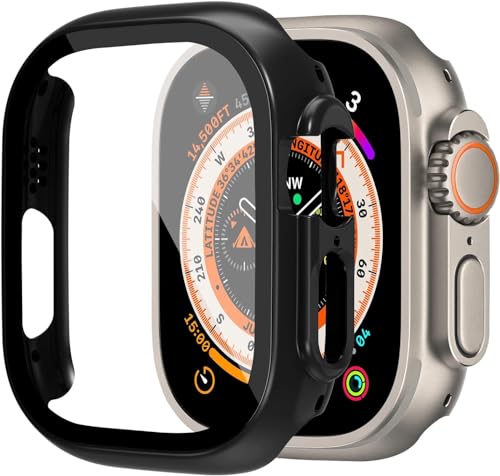 ELMO3EZZ - شاشة حماية لساعة ابل الترا من الموعز حافظة صلبة البولي كربونات مع زجاج مقسى غطاء شامل رفيع للغاية HD اي ووتش 49 ملم للرجال والنساء ملحقات الساعات الذكية اسود