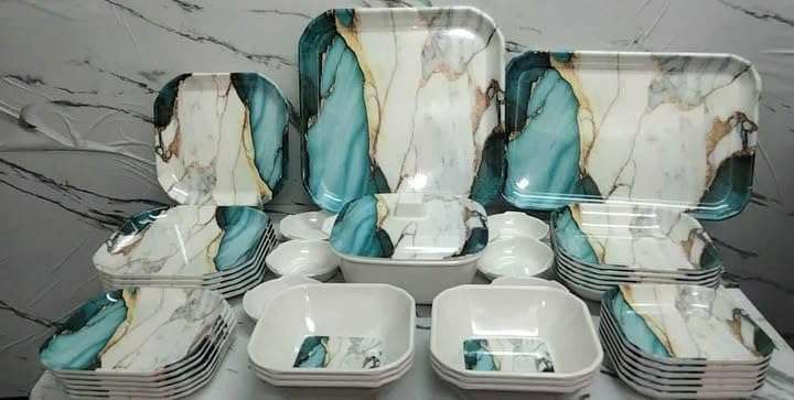 - طقم ميلامين متكامل: يتضمن 40 قطعة من أطباق وأوعية الميلامين بتصميم مربع عصري يناسب الاستخدام اليومي والمناسبات