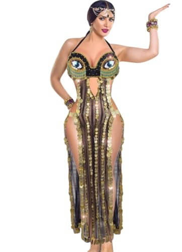 Generic - فستان رقص شرقي مطرز، تصميم عين أسود وذهبي مع شراشيب فري سايز