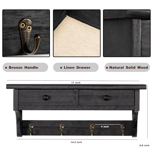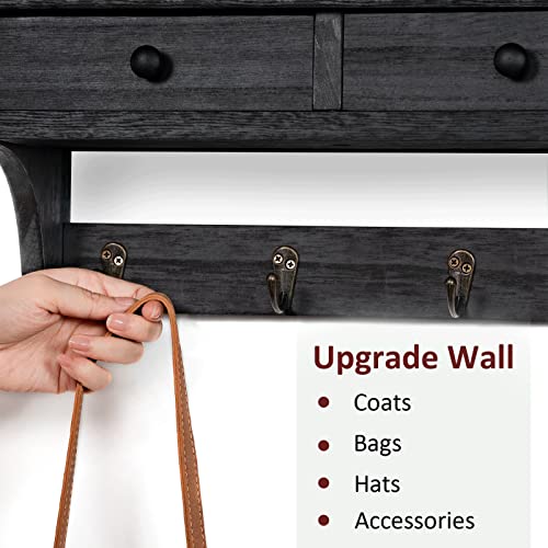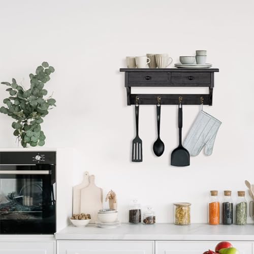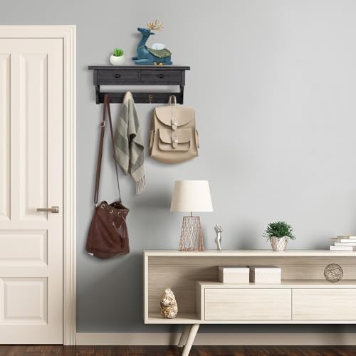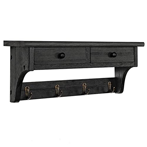 Emfogo - ايموفوجو خطافات معاطف تثبت على الحائط، رف معاطف خشبي ريفي يثبت على الحائط مع خطافات، رف معطف على الحائط مع رف وخطاف معطف عتيق للمدخل وغرفة النوم والمطبخ والحمام (اسود)