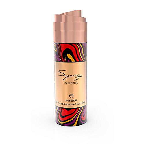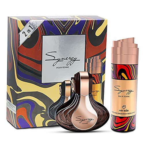 - مجموعة عطر ميرادا او دي بارفان سينرجي بور فيم 100 + 200 مل من ميرادا هو عطر زهري وأنثوي وجميل، مثالي للسيدات من جميع الأعمار ومثالي للارتداء اليومي. تبدأ الرائحة بروائح عليا حلوة ومثيرة وتستمر بقاعدة الياسمين السريعة ولمسة نهائية من العنبر المسكي.