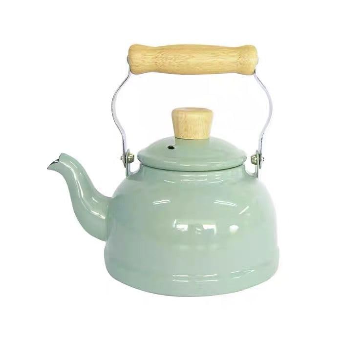 Generic - غلاية شاي مطلية بالمينا، سعة 1.7 لتر، اخضر فاتح، مقبض خشبي
